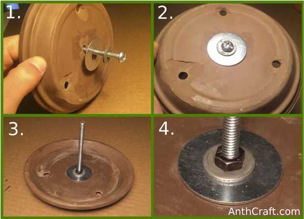 1. De la parte inferior de la placa de cerámica puesto el perno por el agujero central con la arandela (s). Si estás usando dos arandelas como yo Asegúrese de que la arandela grande es contra la cerámica y luego el pequeño es sobre la gran lavadora.