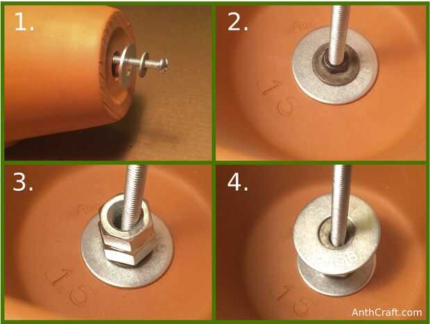 3. Poner a tus separadores el perno de sujeción. Recuerda: Que puedes hacer cualquier cosa. Si es un pequeño tubo metálico, un tamaño de acoplamiento, o incluso una tonelada de arandelas, nada obras. Usé dos tuercas grandes como mis separadores. Nota: Solo desea tu espaciador para ser cerca de 1". Demasiado grande de un espaciador hará su interior flor olla palillo hacia fuera por debajo de la olla grande.