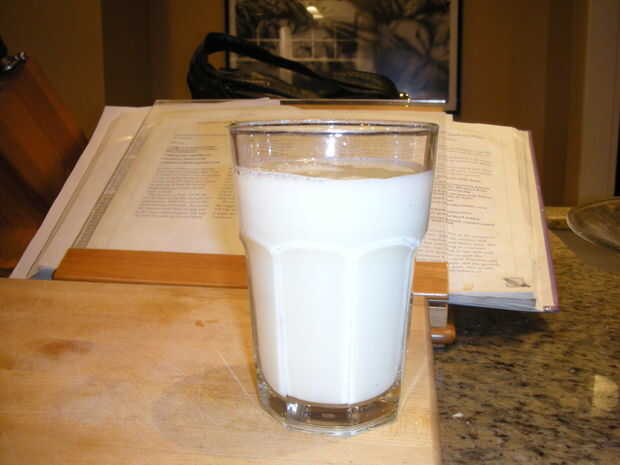 La receta que usé originalmente llamado para una taza de leche, pero que no encajan en mi taza más pequeña, así que al final, derramé cuánta leche quería en la taza de cristal para medir cuánta bebida quiero. Aquí, llena mi copa porque estaba sediento y tener un mal día.