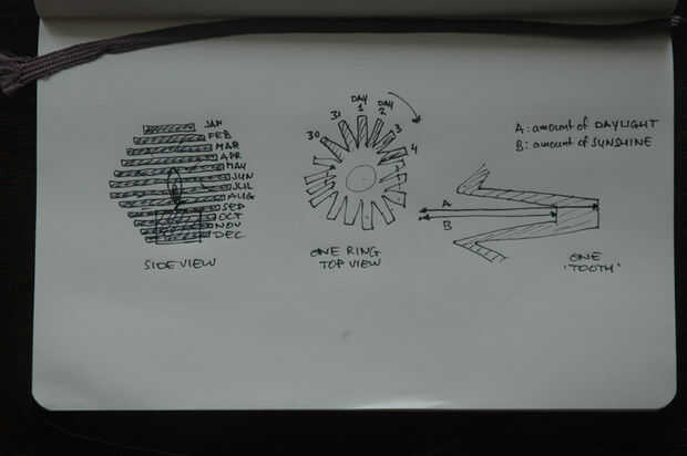 La idea es hacer una pila de discos, 12 en total, uno por cada mes. Cada disco como un agujero (por lo que es realmente un anillo), para hacer espacio para la luz del té, la llama y el aire caliente. Cada anillo tiene tantos dientes (que es la palabra correcta?) ya que hay días en el mes representa. Los dientes se disponen las agujas del reloj, comenzando con el primer día del mes y terminando con el último día del mes. La longitud de cada diente depende del número de horas de luz (es decir, puesta del sol - amanecer). El interior del anillo no es regular: cada diente se hace 'hueco', el vacío dependiendo del número de horas de sol durante ese día. La imagen de arriba que hará claro.
