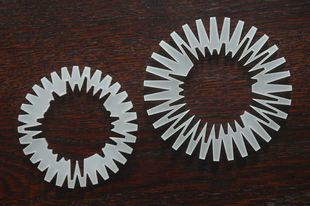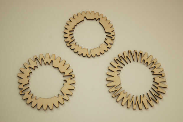Necesita retocar un poco con la configuración del corte del laser: ajuste la velocidad del láser (en milímetros por segundo) y su poder (es decir, cómo contundente su viga debe ser). Todo esto depende del material utilizado. Cuando se utiliza madera contrachapada fina puede utilizar velocidades más altas y una energía más baja entonces al usar plexiglás u otro material 'más dura'. Es sólo una cuestión de ensayo y error: dibujar unas formas simples (por ejemplo, círculos) y variar la velocidad y la energía hasta que usted averiguado en qué configuración del láser atraviesa el material. En mi caso (vidrio de acrílico de 5 mm), tenía que poner la velocidad de hasta 3 mm por segundo. Con todo, tuvo bastante tiempo al laser corte 12 todos los anillos...