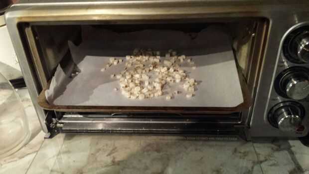 picar en trozos pequeños y extenderlo en una bandeja para el horno. Este es un lote muy pequeño así que usé el horno tostador. Como alternativa puede utilizar un deshidratador pero cuando al horno le da un agradable sabor anuezado.