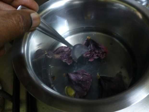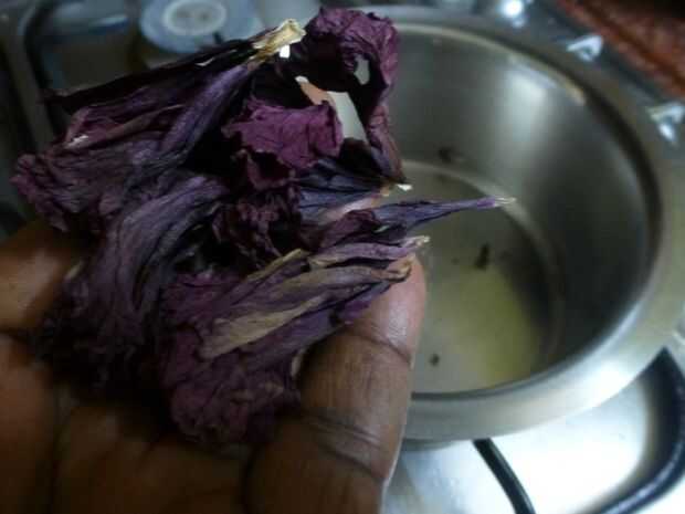 Cuando el agua alcanza un completo punto de ebullición, baje la llama. Añadir un puñado de pétalos de hibisco seco y sumergir en agua hirviendo con una cuchara. Cubrir el recipiente y dejar durante unos minutos.