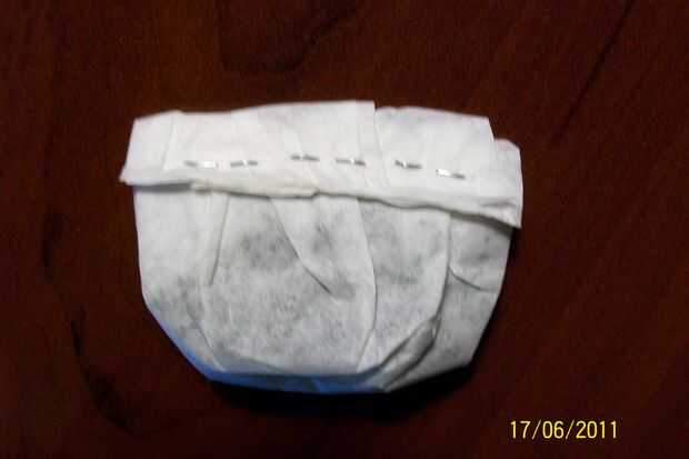 poner el perejil en el centro del filtro, a continuación, tire del borde del filtro juntos (1 º y 2 º cuadro). a continuación, cerrar el filtro de una pulgada del perejil (cuadro 3). básico al lado doble (foto 4) luego cortar el filtro extra (imagen 5 y 6) ahora sólo tiene que añadir una cadena y tienes una bolsa de té!