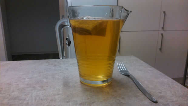 Colgar las dos bolsitas de té en la jarra y llenarla con agua hervida. Ahora le dan una buena mezcla. Después de 2 minutos Haz las bolsitas de té de la jarra y otra vez, mezcle bien. Pruébalo. Si it´s demasiado amargo poner más azúcar en el té helado. Si it´s a dulce, dejar el té bolsos un poco más largo en la jarra.