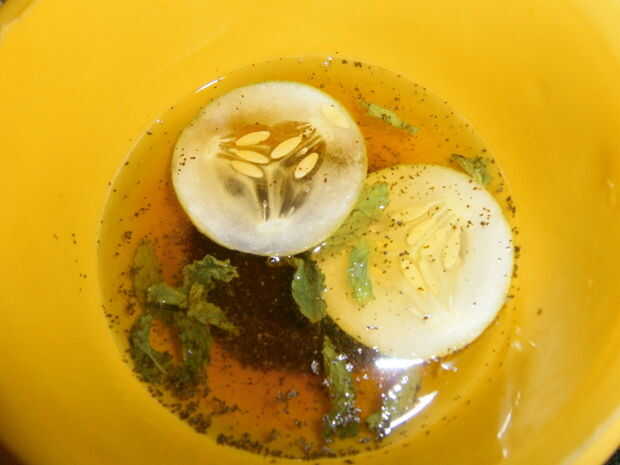 pepino confitada con menta fresca hace un adorno único para pasteles y cócteles o simplemente un aperitivo refrescante para masticar para la solución de azúcar.Todo lo que necesitas es la mitad de un pepino, algunos menta fresca (cuánto depende total