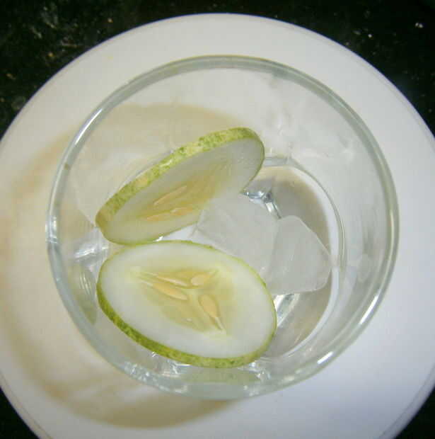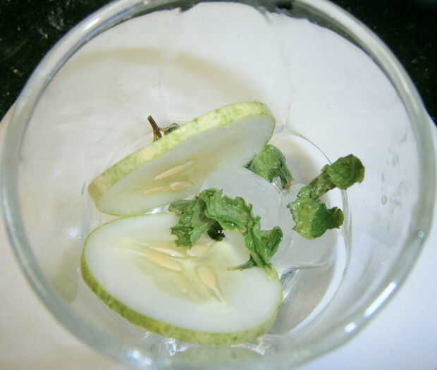 Añadir unos cubitos de hielo, hojas de menta y pepino en rodajas.