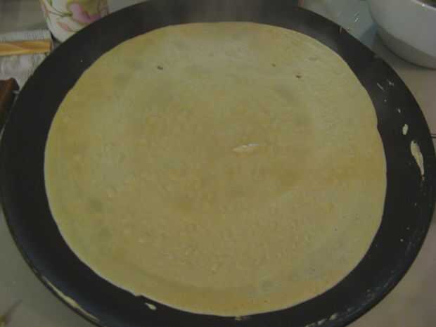 Con una taza o un cucharón, vierta 1/2 taza de la mezcla en el centro de la plancha. Sosteniendo el difusor en sus yemas del dedo por la punta del mango y con el travesaño descansando suavemente en el centro de la masa, mover suavemente la masa en un círculo, manteniendo cerca del centro de la plancha en su primera rotación. Luego, continuar difundiendo hacia el borde exterior hasta que el crepe es el tamaño adecuado (será evidente cuando alguno no separó más lejos).