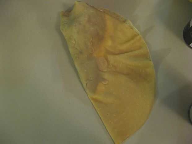 Doblar la crepe con suavidad (no libremente) sobre los rellenos.  Entonces, echar mano de la parte llena y rodar sobre la parte vacía de la crepe, manteniéndolo cerca como usted.  Si los rellenos intentan escapar, sólo volver en después el cono es vertical.