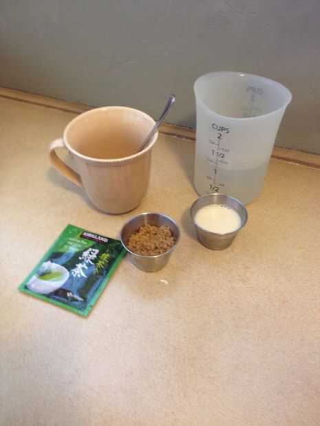 paquete 1 té verde, leche, azúcar, agua caliente, una taza y una cuchara.