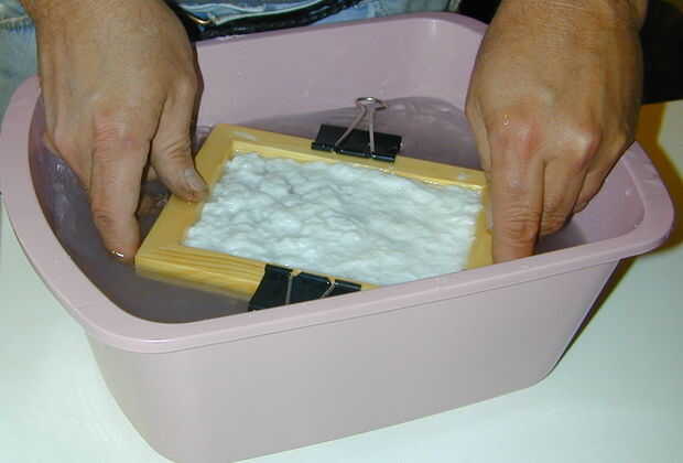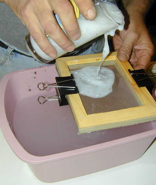 Vierta o cuchara la mezcla de papel desechos a las barbas y parcialmente sumerja las barbas y el molde en agua su papel en repartir uniformemente en las barbas. Desea que aparezca aproximadamente 1/8 a 1/4 de pulgada de espesor. Una vez presionado, será más fino. Sin embargo, no quieres ser demasiado fino o romperá fácilmente si se moja.