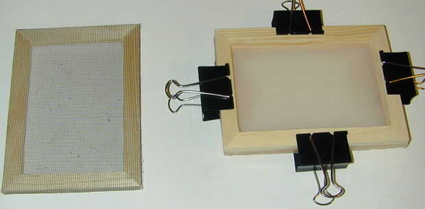 Hemos demostrado dos deckles uno usando pantimedias y la segunda con pantalla de tela de la ventana de una pantalla antigua.