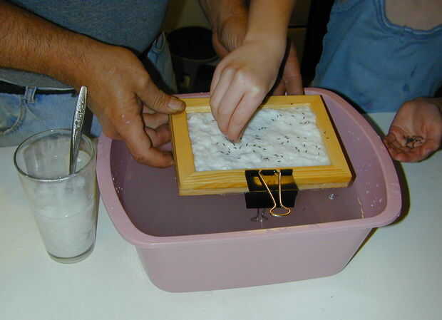 Dependiendo del efecto que usted está buscando, usted puede verter sus semillas en la mezcla de papel o esperar y colocar las semillas sobre el papel.