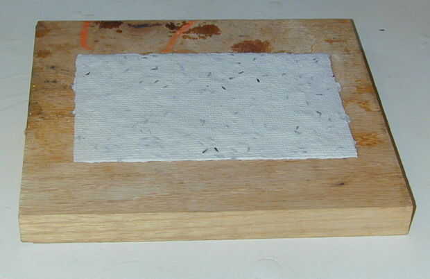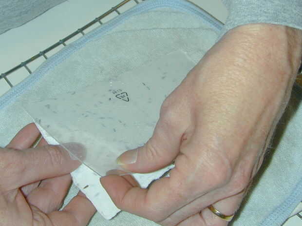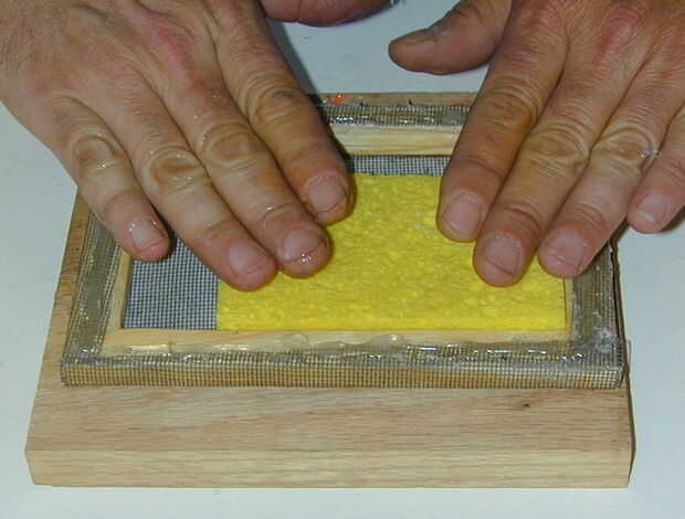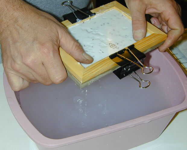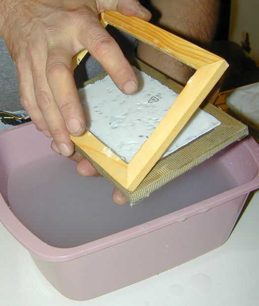 Tomar la pieza de plástico claro que fue en el marco de la foto e insertar en la parte superior del papel recién hecho. Presione hacia abajo hasta que se ha extraído parte del agua. Quite las abrazaderas y las barbas. Usted lo dejó con el molde, papel y plástico. Dale la vuelta sobre una superficie dura y utilizar la esponja para quitar tanta agua de papel como sea posible. Cuando la esponja no absorbe más agua cuando está presionado en la pantalla Retire la pantalla. Cuidadosamente Pele el papel de plástico y colocar el papel sobre la rejilla de secado. Que has hecho tu primera hoja de papel