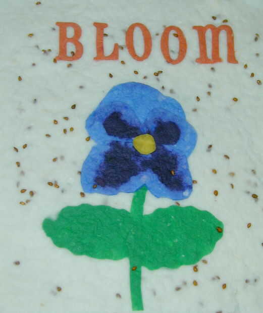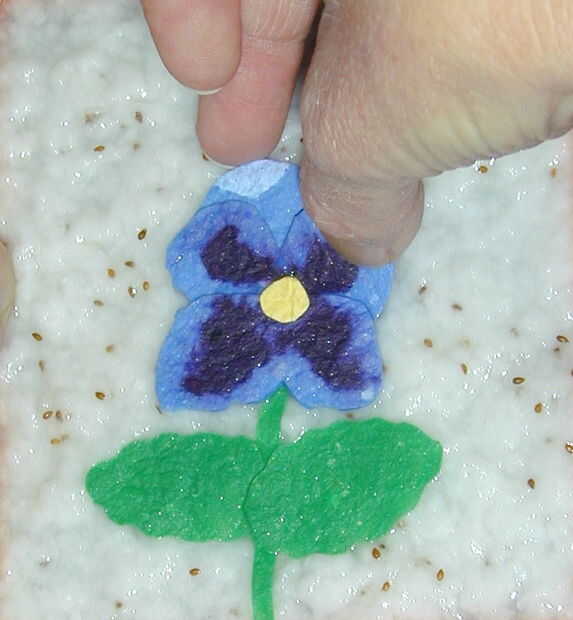 Un ejemplo más de una tarjeta de flor se puede hacer con papel hecho a mano. Para esta tarjeta que hice primero un papel azul con manchas púrpura. Cuando el papel se seca cortar formas de Pétalo pensamiento utilizando las fotos del paquete de semillas como guía. Las hojas fueron hechas con papel hecho a mano verde y el papel de fondo blanco tenía pensamiento semillas mezcladas en la mezcla de pulpa de papel.