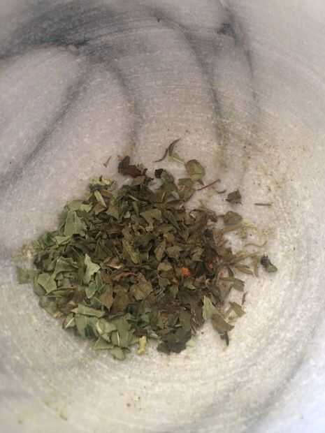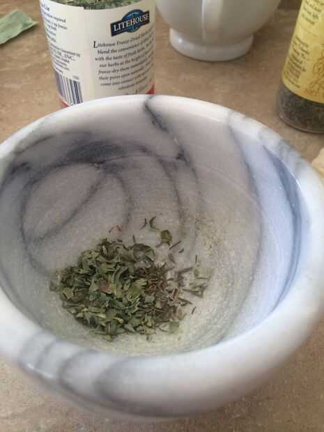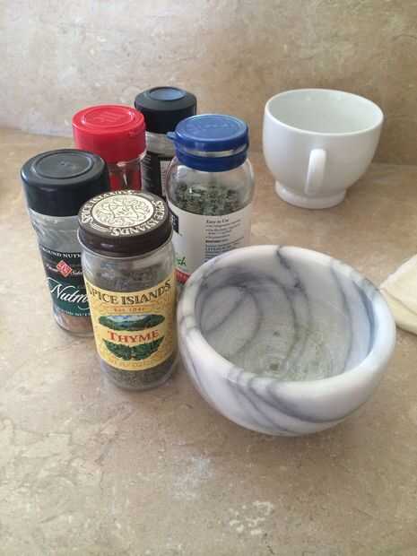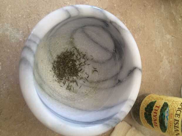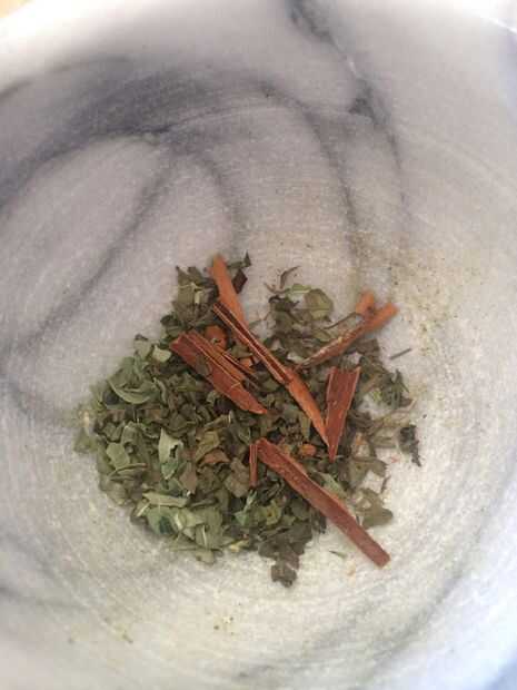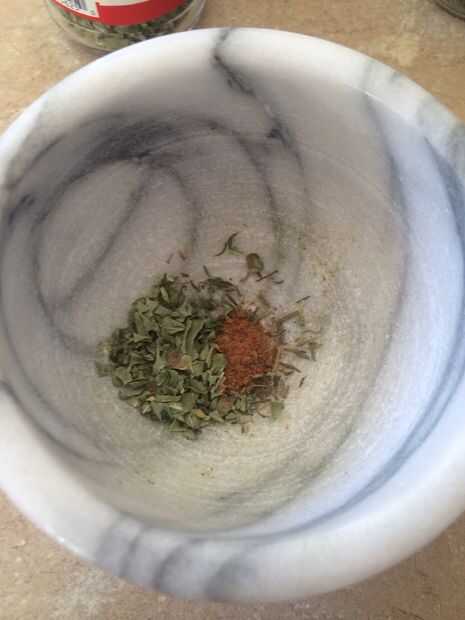 Llevar especias y mortero y machacarlos un poco hasta que usted tiene alguÌ n polvo de las especias y el resto en trozos pequeños.
