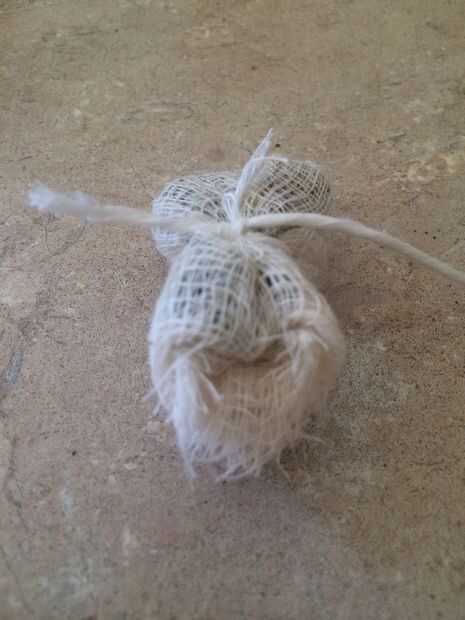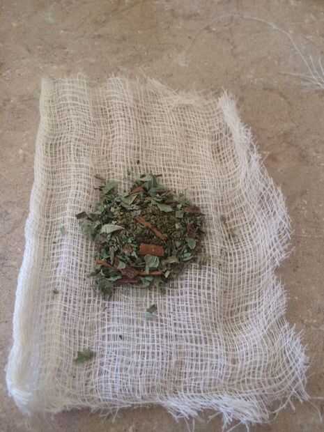 Tomar la mezcla de té machacado y doblar para arriba en el paño. Luego amarrar