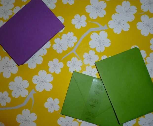 Fui a PaperSource y compró un paquete de tarjetas sobres verdes, púrpura predefinidos doblados y un pedazo gigante de papel amarillo florido. Creo que todo el coste de un total de $15. Por lo tanto, pude haber comprado tarjetas prefabricadas por el mismo precio pero entonces yo no tendría un divertido proyecto!