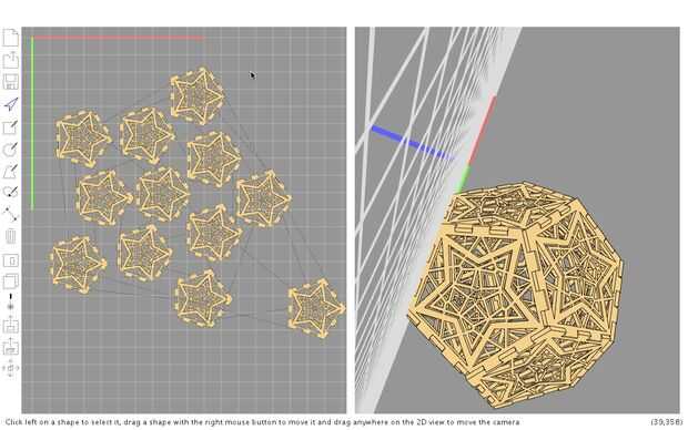 Diseño de una forma (5 esquinas) en inkscape (aquí reutilizado la forma de un copo de nieve de papel - http://www.cncofficesystems.com/blog/diy-paper-snowflakes/) y modificar el esquema con una estructura de la espiga para hacer una estructura 3D. Con el programa CutCAD, que era copia de la forma y conectando los bordes... clase de.