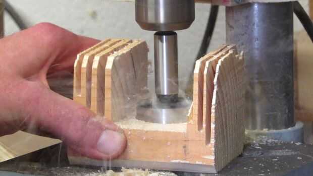 Como mencioné en la introducción, hay una parte del proyecto que se puede hacer en la Sierra de mesa (ver el vídeo en este paso) es mucho más fácil hecho con una broca forstner del tamaño adecuado. En teoría, puede también cortar el frente y orografía de la viga de nuevo completamente y pegamento a un pequeño trozo de chatarra que deja espacio suficiente entre ellos para la candelita en.