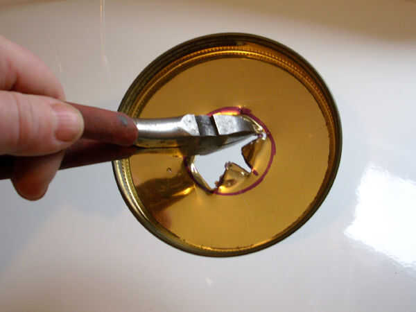 Utilice un cortador de lado o tijeras para hacer varios cortes del agujero del medio al borde de la marca que hicimos en el paso 8. PRECAUCIÓN: los bordes será muy fuerte.