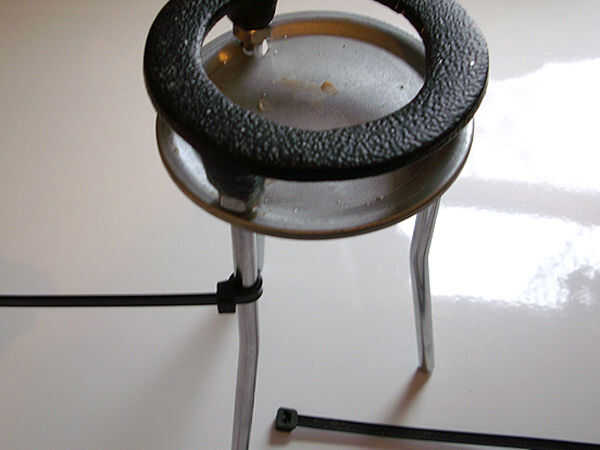 Coloque una abrazadera alrededor de cada pierna. Los lazos deben ser ajustados, pero no inmóvil. Queremos mantener la plataforma de tealight en su lugar, pero todavía tienen la capacidad de deslizarse hacia arriba o hacia abajo. Cortar el lazo de cable sobrante con unas tijeras o cuchillas laterales.