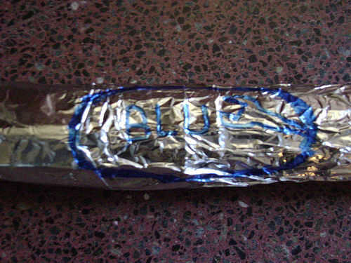 luego usar el rotulador para hacer la BLU o el logotipo rojo en el palo