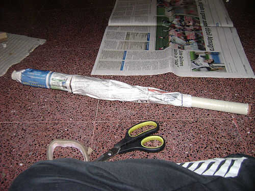 Básicamente, empiezas a envolver periódico alrededor del palillo, dejando dos pulgadas para la parte de agarre.