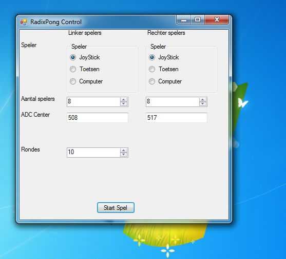 Se añade una ventana de control de entrada. Aquí el usuario puede elegir cómo se funcionan los murciélagos derecho e izquierdos. Es posible utilizar el teclado, o jugar contra el ordenador. También se puede definir el número de jugadores de derecho e izquierdos. Allí se introducen los campos para el ADC centro valores como se describe anteriormente y el número de rondas para un juego completo.