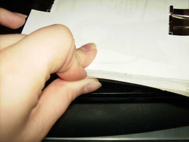 Mirando desde el centro, jale la cinta hacia arriba y ejerciendo presión hacia abajo en las páginas antes de alisar la cinta por el borde. Continuar este movimiento hacia afuera hacia los bordes hasta que el ancho de la notebook se ha asegurado con cinta.