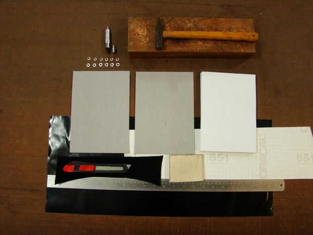 Tapa dura (nuevo o reciclado del antiguo planificador) Hoja Fieltro (los duros utilizados para aplicar adhesivos de vinilo) Su pila de páginas Regla Vinilo adhesivo o wathever quiere envolver la tapa con La moda y el sacador del ojal Cuero de chatarra