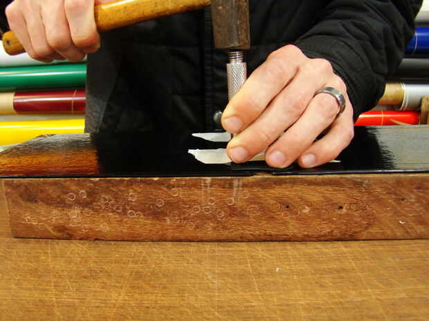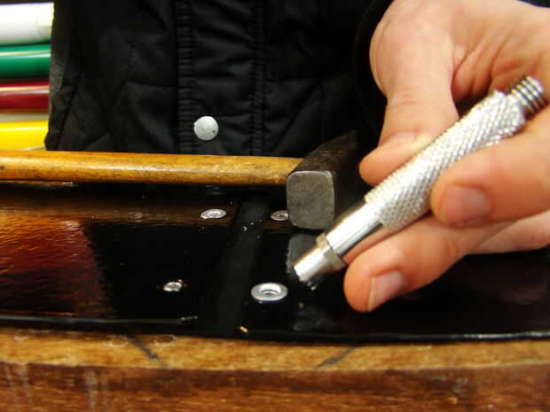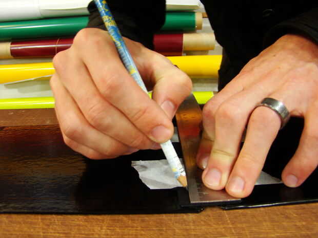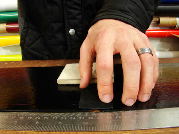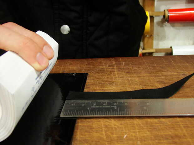 he decidido fijar la tira de cuero en el interior del Bloc de notas. Para medir el tamaño de corte, usé el 15 millimters adicionales de la cubierta (por dos), además de lo 10mm de espesor de 100 páginas, el ancho de la misma siendo como la cubierta. Las dos portadas en una regla, poner un espacio de 10mm entre ellos y el cuero en la posición correcta de la línea. Cinta el cuero hacia abajo y marque el lugar de los ojales, si tiene remaches (no es mi caso) te oculd utilizarlos. Os he puesto 3 ojales en cada cubierta.