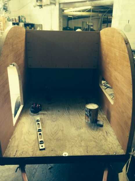 El tabique hermético fue hecho con madera de arce de 1/2". Tornillos de bolsillo se usaron para asegurar la mampara a la pared. Yo no he guardado las medidas exactas pero comparto las consideraciones de diseño que basado mis medidas. El panel inferior, vertical de la pared sería la espalda de los gabinetes de la encimera. Coloqué el tabique hermético lejos que bastante atrás por lo que tendría espacio de encimera adecuada y suficiente espacio en la cabina. La altura de este panel de cierre era la misma altura que yo quería mi encimera a. Los gabinetes superiores pueden ajustarse más lejos sin sacrificar el espacio para los pies. Así que el panel tabique horizontal vuelve alrededor de la mitad de un pie. El panel superior, vertical se extiende entonces a la parte superior de la curva exterior. Esto es donde irá la bisagra de la ventana trasera, así que asegúrese de tener en cuenta al diseñar.