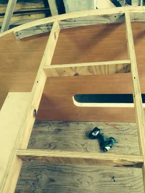 Las costillas están hechas de madera contrachapada de 1/2". Ellos están separados aproximadamente de 8" de separación. Poner una costilla más fuerte (2 x 4) en la base frontal de la curva (no se muestra en las imágenes). Esta costilla tendrá que mantener en el techo interior mientras está siendo curvado. Había enmarcado 12" por 12" Plaza donde se instalaría mi ventilador. Las costillas están aseguradas con pegamento para madera y tornillos de bolsillo.