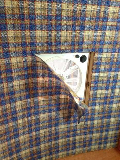 Cubrí el interior de la cubierta con tela/moqueta. Este material fue asegurado con cemento de contacto. Después de cortar un agujero en la tela al descubierto el ventilador, he instalado la pieza de borde interior del ventilador.