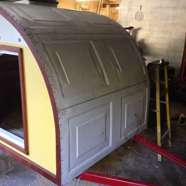Tomó un poco de corte para quitar todo el hardware innecesario de los paneles de puerta de garaje. Es importante mantener intacta para apoyar algunas partes de los paneles (véase la nota en la segunda foto). Sellador se aplicó a los bordes exteriores de la cubierta antes de que los paneles fueron aplicados. Los paneles fueron asegurados con tornillos de acero inoxidable. Tuve problemas con los paneles abollar en lugares pero en general estoy contento con cómo resultó el techo.