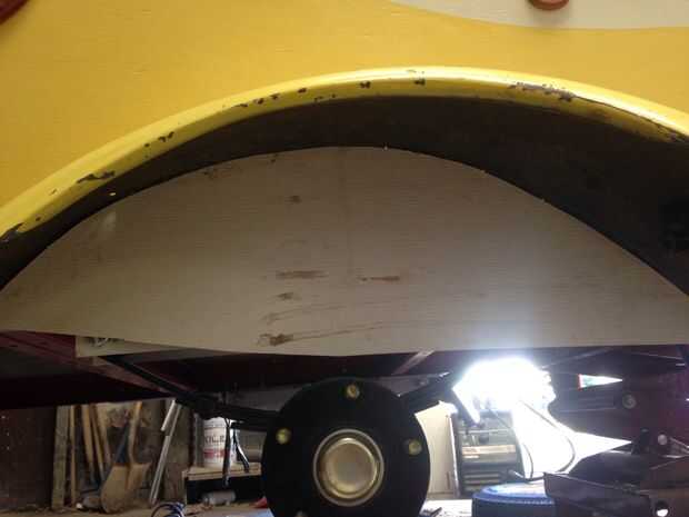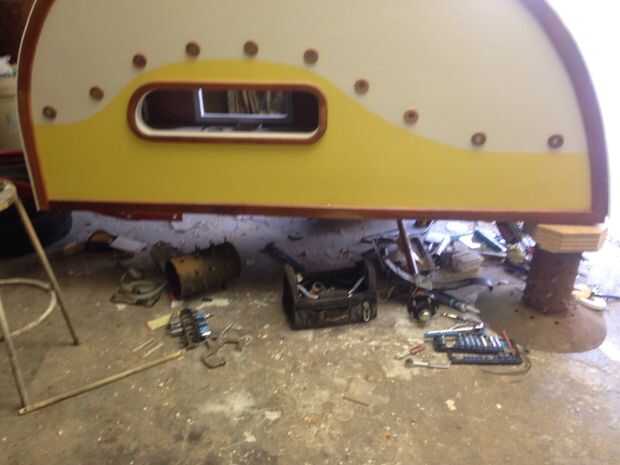 Las defensas vino de un viejo error VW y se cortaron más cortas (las luces no funcionan). Parte de la guarnición se corte por lo que las defensas se ponen plana contra el lado. Las defensas fueron atornilladas, con tornillos de acero inoxidable, a los lados de la caravana. Aluminio cubre el camper por debajo del guardabarros. Esta zona expuesta a una gran cantidad de humedad y el desgaste, por lo que era importante protegerlo. El aluminio fue pegado al lado de la caravana con masilla.