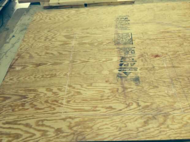 Las paredes exteriores deben extenderse más allá de la planta por lo que puede ser atornillados a la estructura del remolque. Esto también cubre el bastidor del remolque y es más agradable estéticamente. Para planear esto, dibujé una línea paralela al borde largo de la madera contrachapada, de 3 pulgadas por encima del borde inferior. 3 pulgadas es la distancia desde la parte inferior del bastidor acoplado a la parte superior de la planta