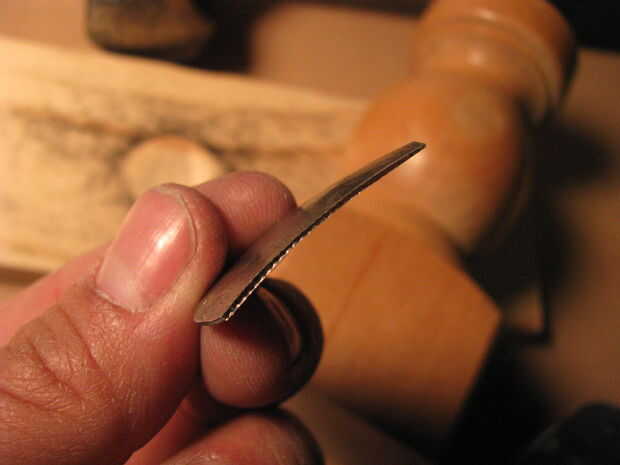 Una vez hecho esto, tome su pieza cortada y colocarlo entre la madera y la herramienta convexa. Utilice un moderado golpe con un martillo. Mantenerse en él hasta que el metal se convierte en convexo. Sólo debe tomar unos pocos golpes.