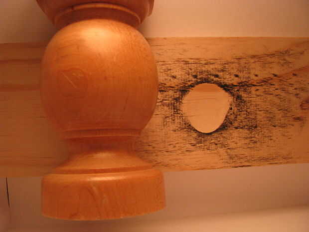 Encontrar una pieza de madera. Entonces encontrar una forma convexa. En este caso he utilizado la sección de la bola desde el eje de un cabecero. Se pueden usar una cuchara o la cabeza de un perno de carruaje.