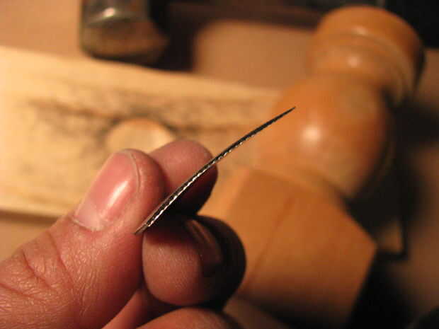 Tomar la forma convexa y colocarlo en la pieza de madera. Utilice un moderado golpe con un martillo para sangrar la madera con la forma convexa. Me froté crayón negro sobre la depresión para mostrar a chicos cómo la madera tuvo en la forma.