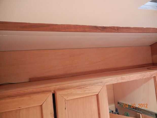 - La parte inferior de los armarios laterales también fueron cubiertos con madera contrachapada cereza cortada a la medida.