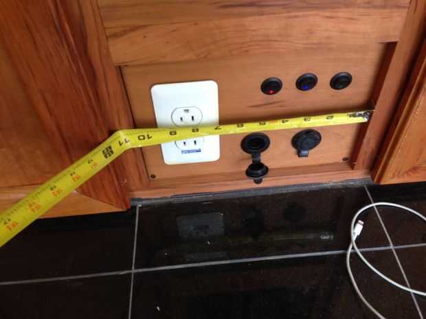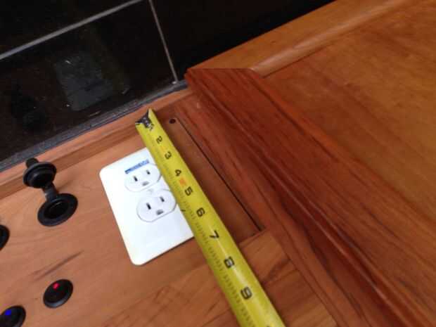 - La tapa del gabinete entonces fue cortada de la madera contrachapada de 1/2"- Esto fue cortado para caber. Inicialmente se redujo a 69 1/2" de ancho y 24" de profundidad, pero las dimensiones de la cabina no eran perfectas, así que tuve que recortar un poco en anchura para conseguir que se ajuste. También nota el agujero con los cables que salen a través de ella en la foto 8.