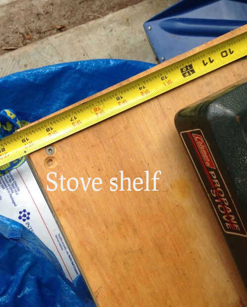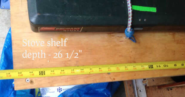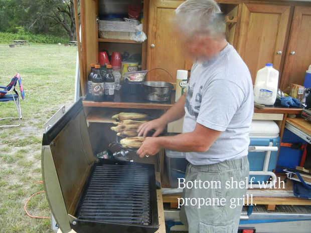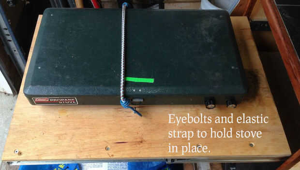 Los dos estantes a la izquierda tenían pernos de ojo agregado a su superficie y ganchos de sujeción de goma se utilizan para mantener la estufa y parrilla en su lugar cuando no están en uso.