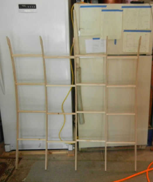 - También corté 3/4" de pulgada de la parte inferior de cada uno de los 5 refuerzos interiores y cortar 1 1/2" de la parte superior de cada costilla - no cortó un completo 3/4" y 1 1/2" al principio - cada corte un poco tímido del final tamaño apto para darme algún margen de maniobra en caso algo no encajarán bien - una vez que seco ajuste cada puntal y verificar cuánto adicional corte era necesario terminar los cortes. Nota: corté la parte superior y la parte inferior - solo hacking de 2 1/4" de un lado o el otro habría dado lugar a arcos que ya no coinciden los arcos de la pared de cabina.