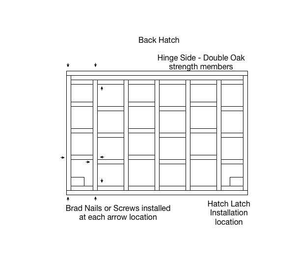 - Instalación del arco soportes transversales se realizó utilizando clavitos de 1 1/2" en la clavadora de acabado. I cubrir cada extremo del travesaño con pegamento, posición y conducir 2 clavos en cada extremo. Observe en el dibujo y las fotos que cada soporte se compensó del adyacente por lo que podría conseguir las uñas en recto. También poner a separadores entre cada arco en la parte superior e inferior de la escotilla y clavada/pegada en lugar.