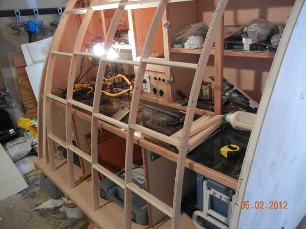 - A continuación cortar el arco traviesas, suéltelas. He utilizado listón disparo otra vez (todos la izquierda sobre las piezas de la estructura del techo de la cabina se utiliza aquí). No recuerdo la longitud nominal corté el listón de la leña-11 1/2" para las localizaciones interiores y menos para los puntales entre el borde de la escotilla y los primeros arcos en a la izquierda y derecha. Hace 36 de estos puntales inicialmente y luego añadió algunos adicionales en apoyo para los cierres de la portilla y para puntos de montaje para las luces de inundación.