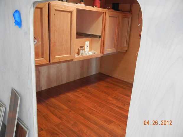 13. Después el piso de abajo, he instalado el corcho para la cabecera e instalado el adorno final alrededor de toda la planta que cubre hasta los bordes del piso con 1/2" cuarto redondo sostenido en lugar con clavitos de acabado.