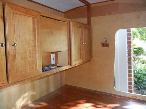 1. Ajuste - el interior del remolque tiene trim cerezo sólido - hice el remate en la tienda y consistió en cerca de 80 pies de 1/8 "x 3/4" plano ajuste de articulación 1 borde de 6' a 8' largo 3/4" de cereza Junta seguido de cortar al hilo 3/16" de la Junta, el borde rasgado de la Junta de Unión y repetir la extracción y la articulación hasta que tuve toda la moldura plana - hice unos 20 pies más pensé que necesitaba - por si acaso. La moldura de 3/16" entonces fue enarenada en ambos lados con una lijadora de banda que trajo el grueso abajo a cerca de 1/8". Este espesor fue elegido porque las curvas de la cabina y el deseo de ocultar los bordes donde la madera contrachapada en interiores y las paredes interiores vinieron juntos y donde se unieron las piezas individuales de las articulaciones de madera contrachapada de techo interior de 1/8".