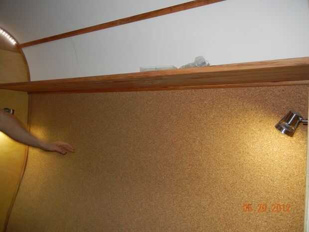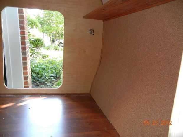 9. Acabado el piso consistió en poner 1/4" underlayment del corcho en el suelo y a medio camino encima de la pared frontal. Seleccioné el corcho para su aislamiento y propiedades de reducción de sonido en lugar de usar nuevos materiales artificiales. Usando el corcho como el tablero principal de la pared delantera realmente ayuda a amortiguar el sonido reflejado dentro de la cabina y sonidos provenientes de fuentes exteriores.